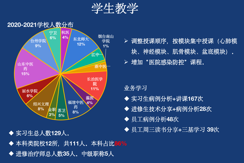 目前康复医学中心包括庆春院区、下沙院区、双菱院区,其中庆春院区设置了康复门诊,主要开展门诊治疗及床边康复诊疗工作;下沙院区设置门诊和41张床位的康复病房,细化了神经运动治疗区、肌骨运动治疗区、神经作业治疗区、肌骨作业治疗区、针灸推拿区、言语治疗区、盆底治疗区等,主要开展临床疾病恢复期功能障碍康复。双菱院区设置康复专科床位16张,主要收治肌骨疾病和疼痛治疗患者。