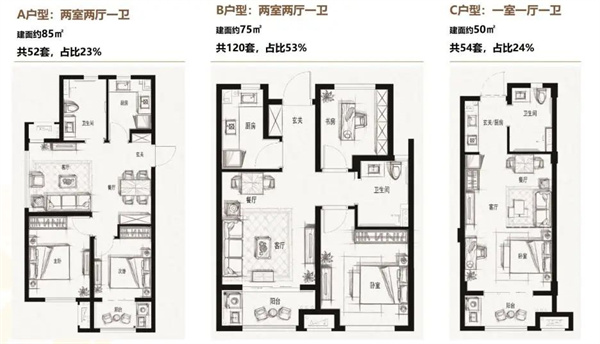 户型:建筑面积约50㎡、75㎡、85㎡